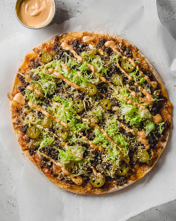 - Bake the assembled pizza for 5-7 minutes until cheese is melted. Top with pickles, lettuce, tomatoes, and drizzle with sauce.