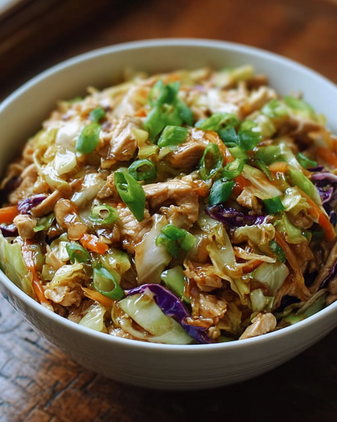 A delightful twist on traditional egg rolls, combining ground chicken, fresh cabbage, and spices in a hearty bowl.