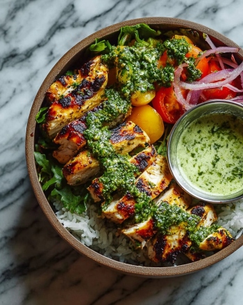The Chimichurri Chicken Bowl is a vibrant and nutritious dish that features grilled chicken, fresh vegetables, and a zesty chimichurri sauce. This bowl is built on a base of quinoa, topped with ingredients like cherry tomatoes, avocado, corn, and mixed greens. The chimichurri sauce, made from fresh herbs, garlic, and olive oil, adds a burst of flavor that elevates the entire meal. It’s a perfect option for those seeking a healthy and satisfying meal.