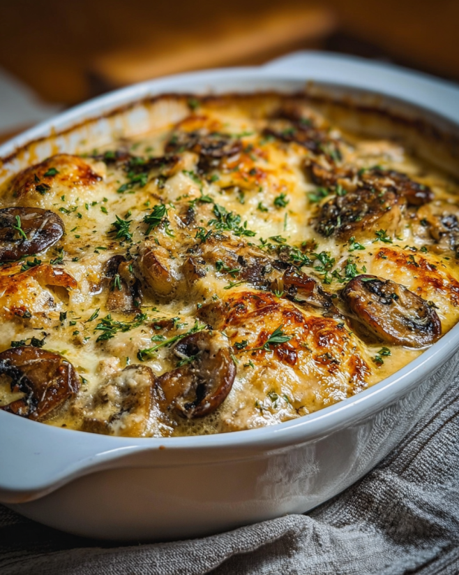 A comforting casserole combining tender chicken, earthy mushrooms, and a creamy sauce, perfect for family dinners or potlucks.