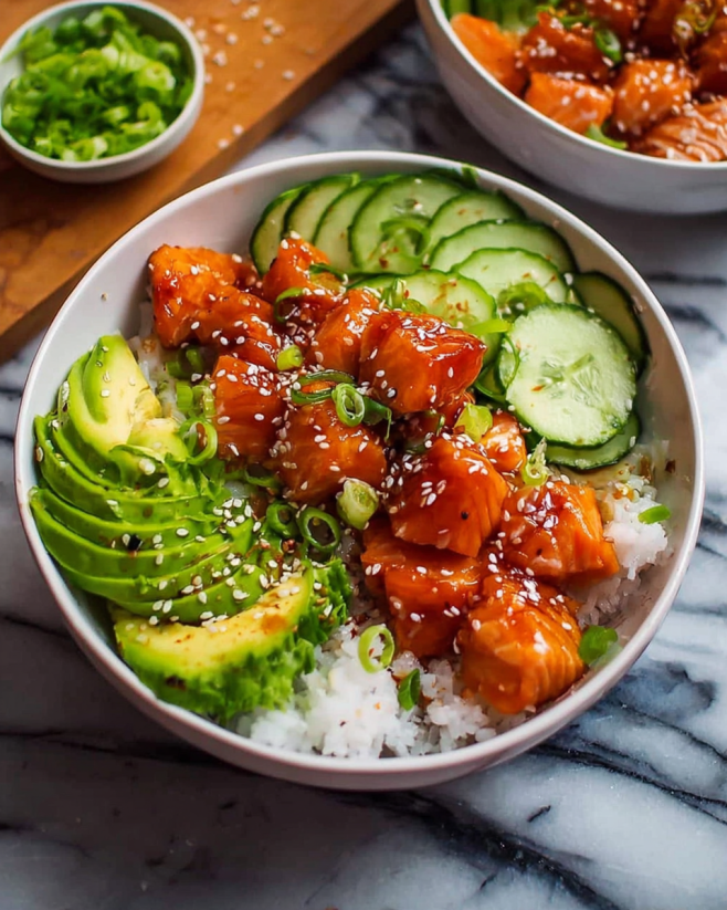 Honey Sriracha Salmon Bowl Recipe is here to satisfy your cravings. This dish combines the rich flavors of salmon with a sweet and spicy sauce, creating a delightful experience for your taste buds.