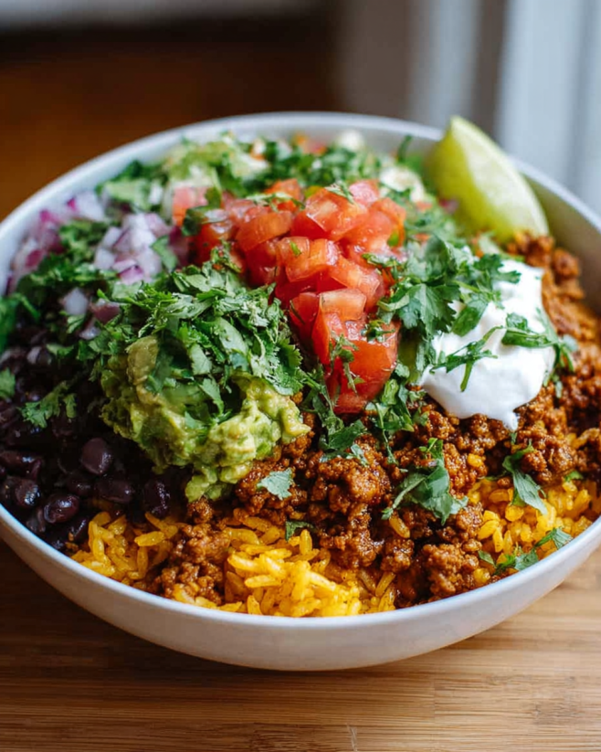 The prep time for the Taco Rice Bowl Recipe is approximately 15-20 minutes. During this time, you’ll gather all your ingredients, chop vegetables, and measure out the rice and meat. Having everything ready before you start cooking makes the process smoother and more enjoyable.