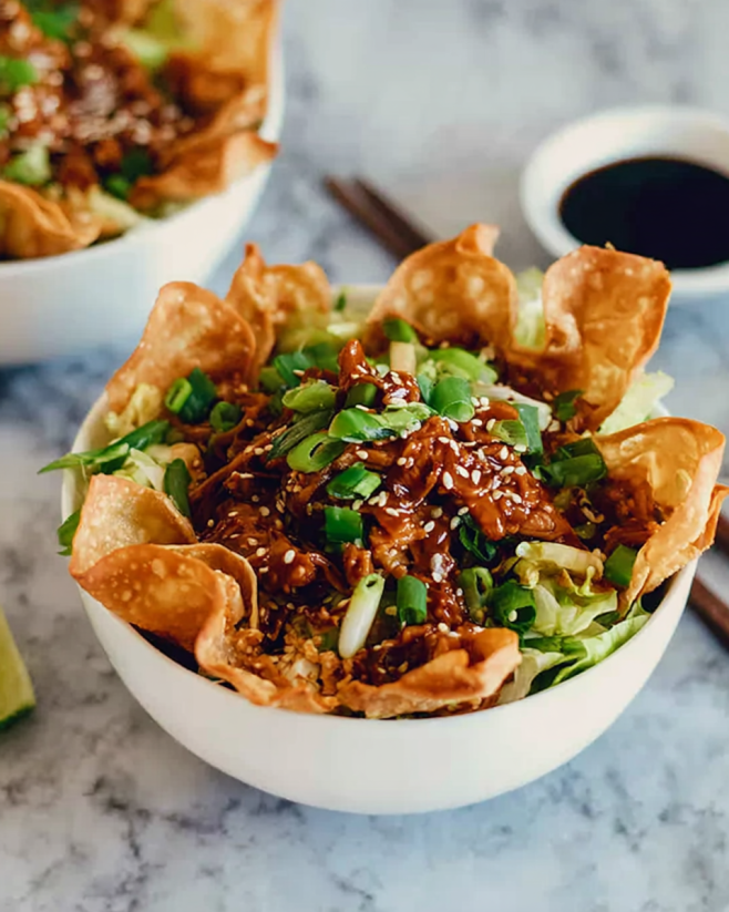 These ingredients come together to create a delightful dish that is both satisfying and fun to eat. The teriyaki sauce adds a sweet and savory flavor, while the wonton wrappers provide a crispy shell that holds everything together. Feel free to adjust the toppings to your liking, as this dish is all about customization!